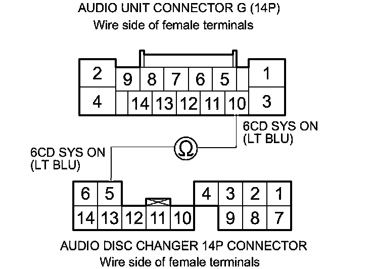 Repair an open or high resistance in the wire between audio disc changer 14P connector terminal No. 10 and audio unit connector G (14P) terminal No. 1.�