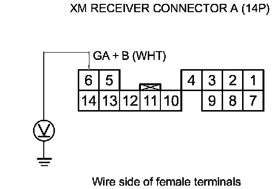 8. Measure the voltage between XM receiver connector A (14P) terminal No. 6 and body ground.