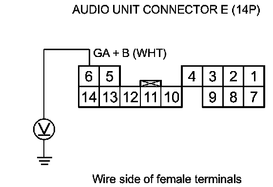 9. Measure the voltage between body ground and audio unit connector E (14P) terminal No. 6.