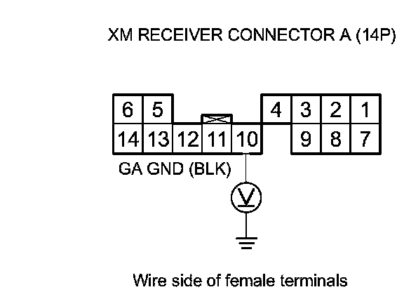 11. Measure the voltage between XM receiver connector A (14P) terminal No. 10 and body ground.