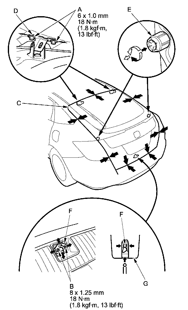 - Adjust the fit between the tailgate and the tailgate opening by moving the striker (F), and adjust the striker right or left until it is centered in the tailgate latch (G).