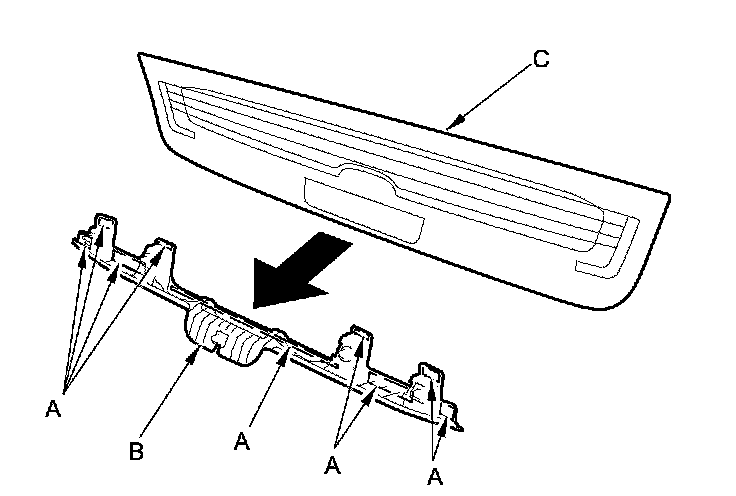 2. Separate the double-sided adhesive tapes (A), then remove the rear license trim (B) from the lower rear window (C).