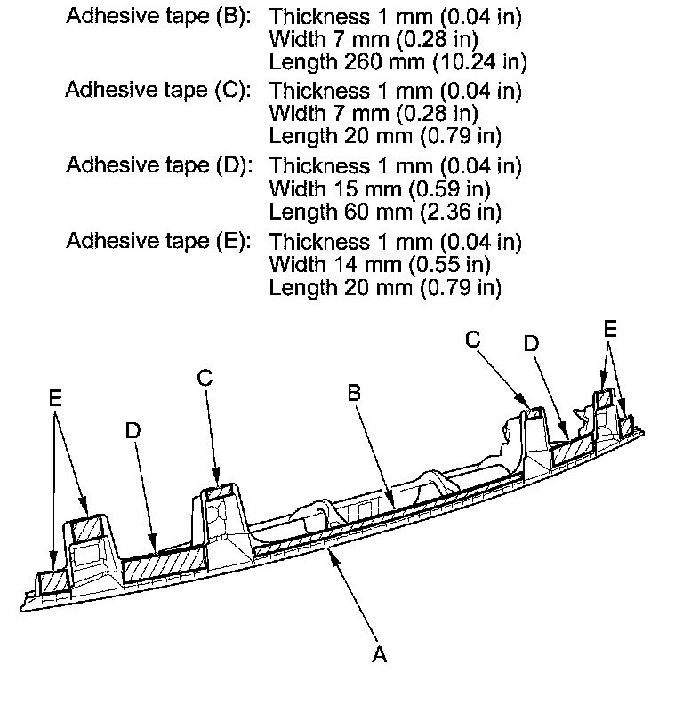 4. If you are reusing the original rear license trim (A), apply PP primer to the areas where the new double-sided adhesive tapes (B, C, D, E) will be applied, then attach the new double-sided adhesive tapes to the trim as shown.