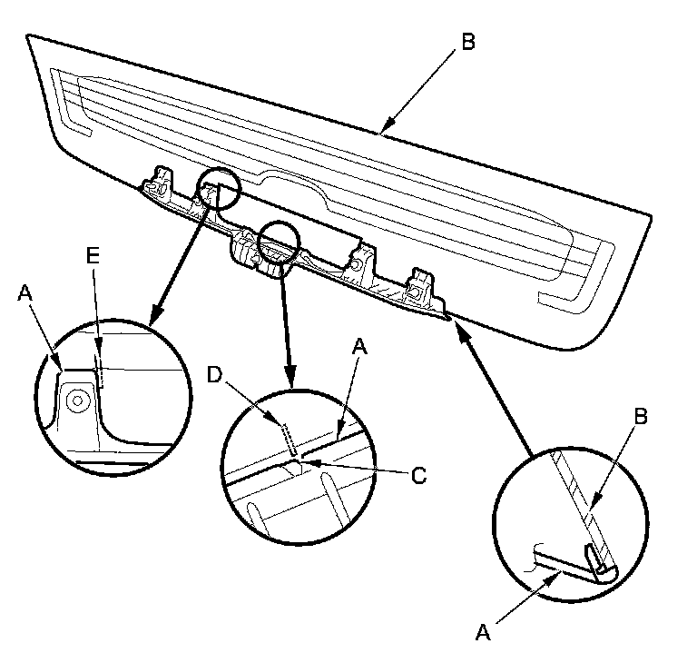 5. Apply PP primer to the bonding surface of the rear license trim (A), then attach the trim to the lower edge of the lower rear window (B).