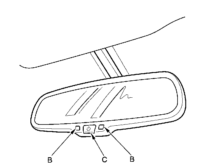The automatic dimming inside mirror has a front-facing lux level sensor (A), rear-facing lux level sensors (B), and a control unit. The control unit receives signals from each sensor. Based on the difference between the two lux levels (the light outside the vehicle and the light from the headlights of the other vehicle, etc.), the control unit controls the electro-chromic gel to reduce glare. This dimming function is canceled when the shift lever is in R position, or when the automatic dimming off button (C) is turned OFF.