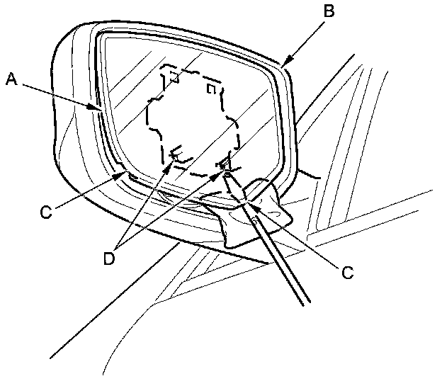 3. Apply heat with a heat gun to the gap between the mirror holder (A) and the mirror housing (B). Carefully pull out the bottom edge of the mirror holder to separate the adhesive (C), then release the side hooks (D).