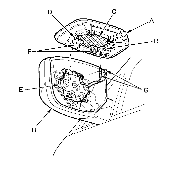 4. Separate the mirror holder from the actuator (E) by releasing the hooks (F). If equipped, disconnect the mirror defogger terminals (G).