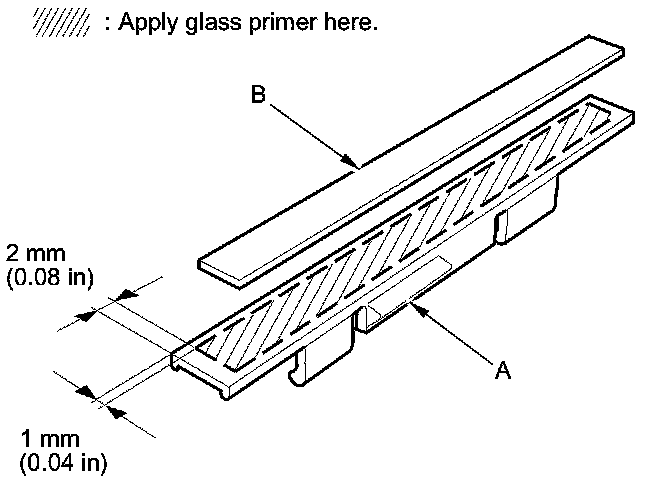 4. If you are reinstalling the original rearview mirror harness cover base (A), scrape off all of the original adhesive tape from the base with a putty knife. Clean the base surface with isopropyl alcohol. Apply primer to the base as shown, and attach the adhesive tape (B) to the base.