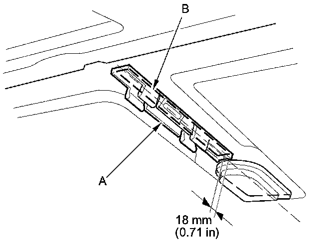 6. Attach the rearview mirror harness cover base (A) with the adhesive tape (B) to the inside face of the windshield as shown, then press the adhesive area into place securely.