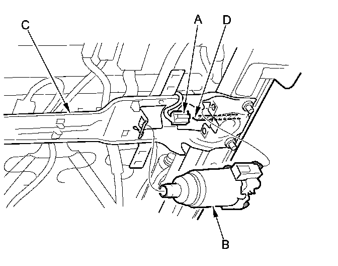 3. Disconnect the slide motor connector (A), then remove the slide motor (B) from the slide motor bracket (C) while disconnecting the motor from the short flex cable (D).