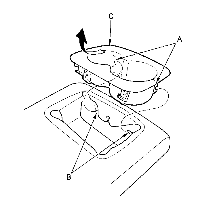 2. Release the front hooks (A) from the wire (B), then remove the armrest beverage holder (C).