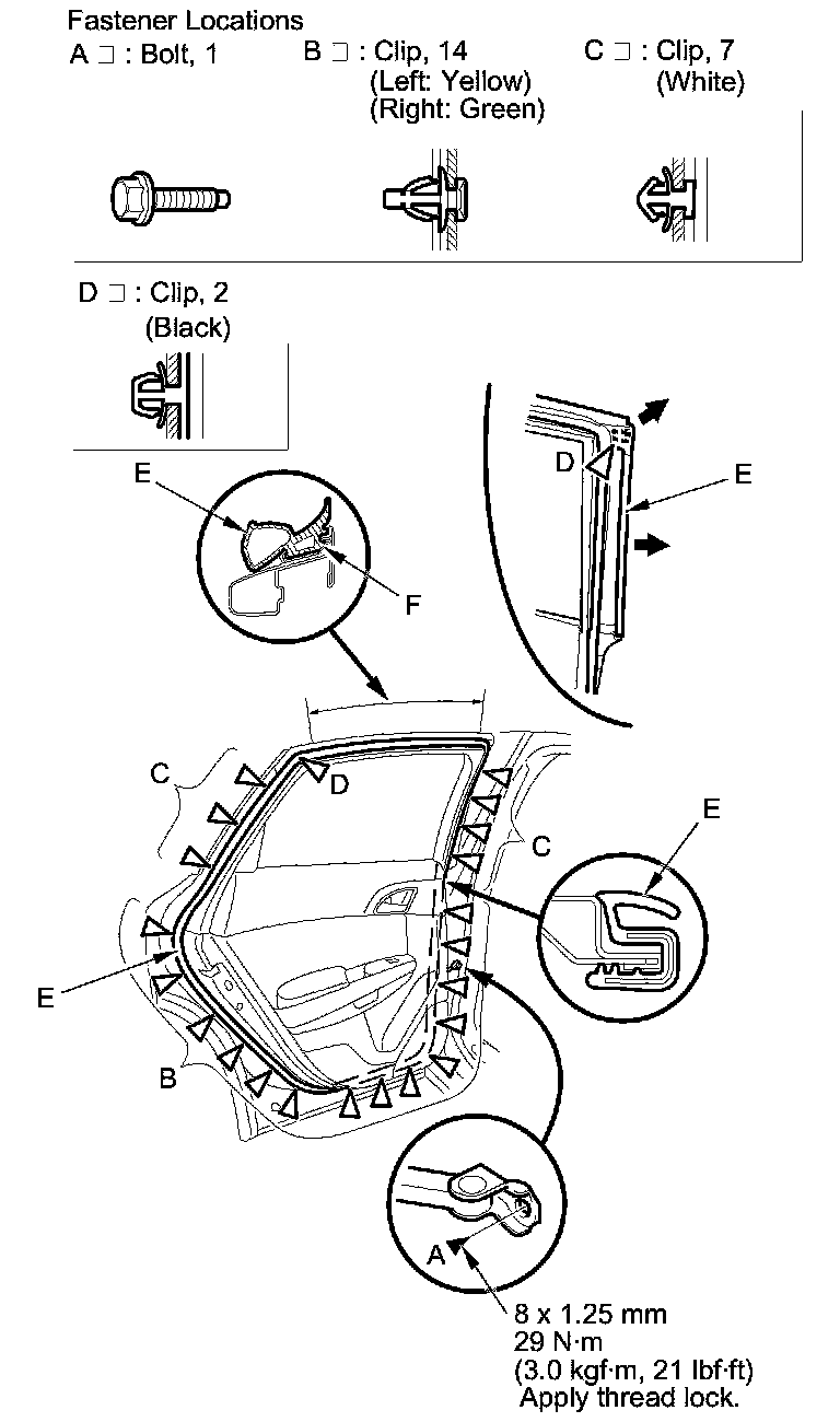 2. Detach the clips (B, C, D), and release the door weatherstrip (E) from the holder (F) of the door sash, then remove the weatherstrip.