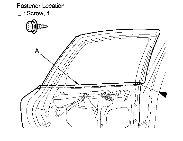 2. Remove the screw from the front edge of the door securing the door glass outer weatherstrip (A).