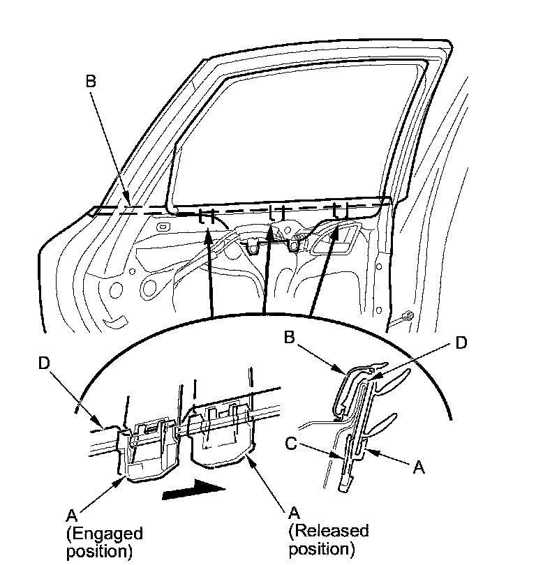 3. From the inside of the door, slide the clips (A) of the door glass outer weatherstrip (B) to release the hooks (C) from the flanges (D) of the door panel.