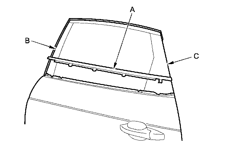 4. Pull up the door glass outer weatherstrip (A) while passing the front and rear edges of the weatherstrip over the door sash outer trim (B) and the door rear sash outer trim (C), then remove the weatherstrip.