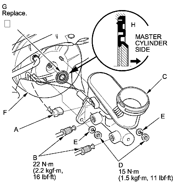 6. Remove the master cylinder from the brake booster (F). Be careful not to bend or damage the brake lines when removing the master cylinder.