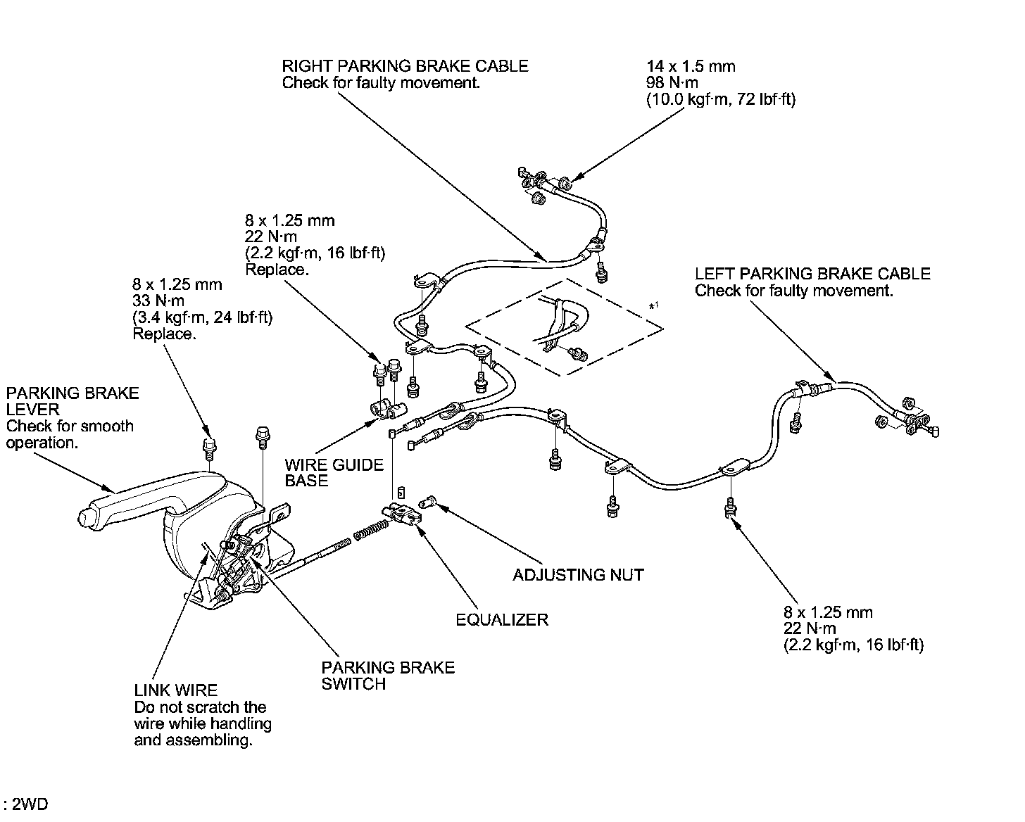 - The parking brake cables must not be bent or distorted. This will lead to stiff operation and premature cable failure.