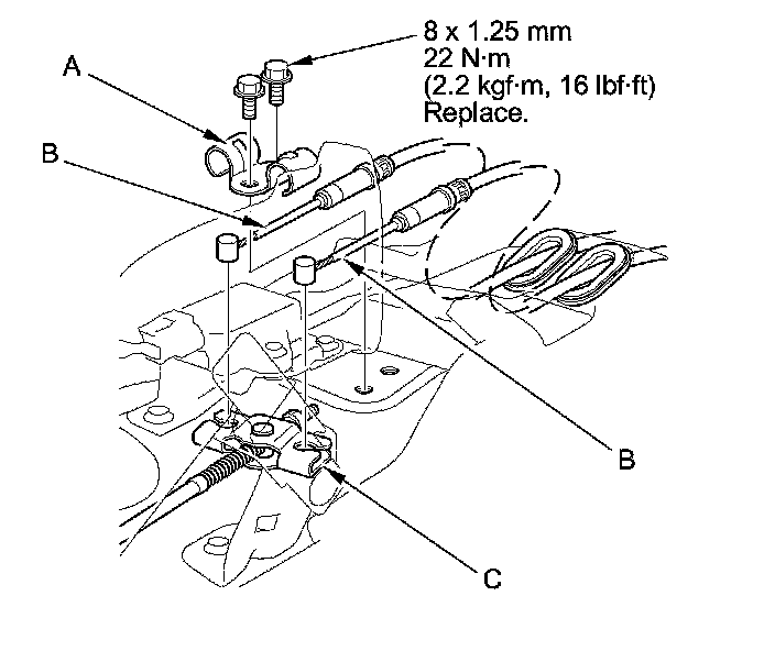 3. Remove the wire guide base (A), then disconnect the parking brake cables (B) from the equalizer (C).
