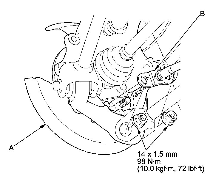 5. Remove the parking brake cable mounting nuts from the backing plate (A), and remove the parking brake cable (B).