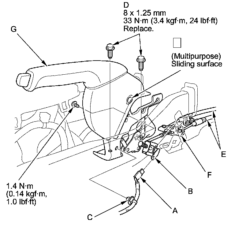 5. Disconnect the parking brake cables (E) from the equalizer (F), then remove the parking brake lever (G).