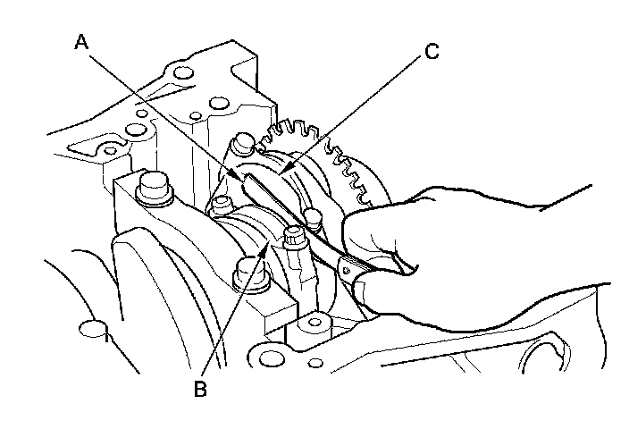 3. Measure the connecting rod end play with a feeler gauge (A) between the connecting rod (B) and the crankshaft (C).