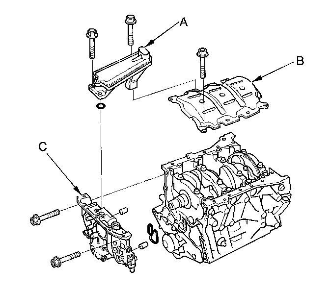 9. Remove the oil strainer (A), the baffle plate (B), and the oil pump (C).
