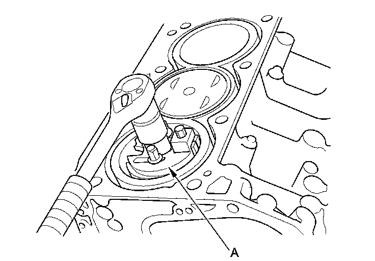 18. Lift the crankshaft (A) out of the engine block, being careful not to damage the journals and the CKP pulse plate.