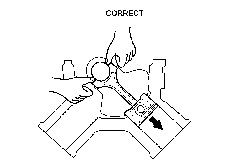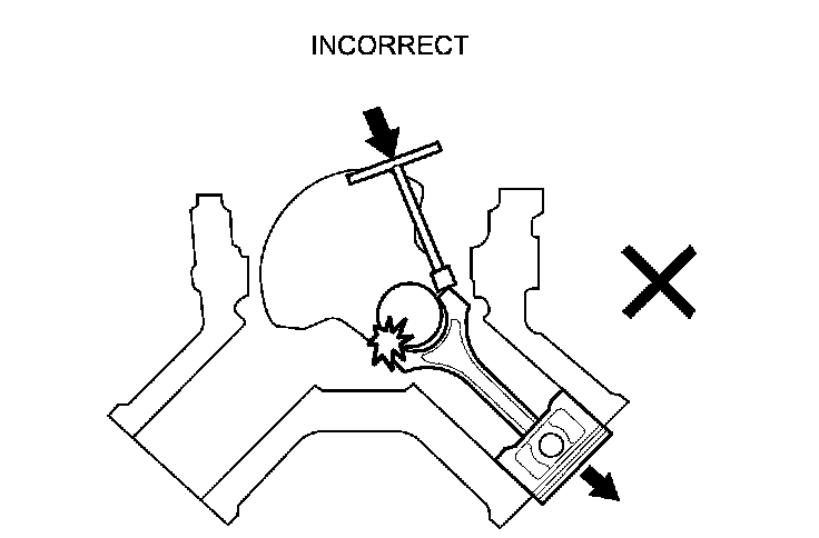 11. Remove the connecting rod caps after setting the connecting rod journal at bottom dead center (BDC) for each cylinder. Remove the piston/connecting rod assembly by pushing on the connecting rod. Take care not to damage the oil jets, the connecting rod journal, or the cylinder with the connecting rod.