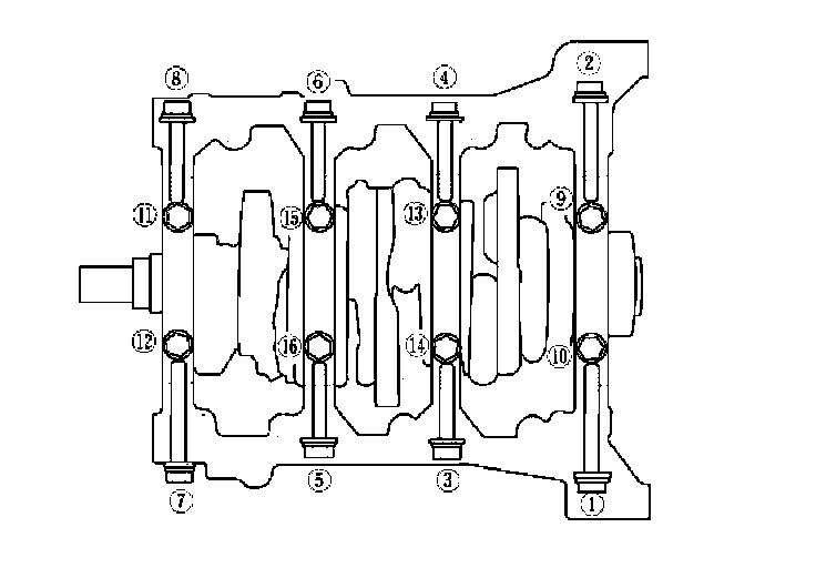16. Loosen the bearing cap bolts and the bearing cap side bolts in sequence 1/3 turn at a time; repeat the sequence until all bolts are loosened.