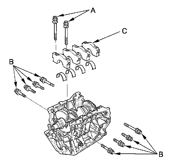 17. Remove the bearing cap bolts (A) and the bearing cap side bolts (B), then remove the main bearing caps (C).