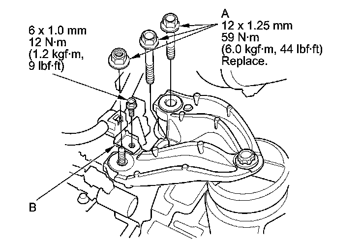 7. Tighten the new upper transmission mount bracket mounting bolts/nut (A) to the specified torque, then install the harness bracket (B).