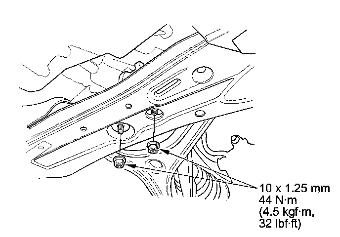 14. Discard the subframe middle rubber mount bolts (A), then tighten the new bolts to the specified torque on both sides.