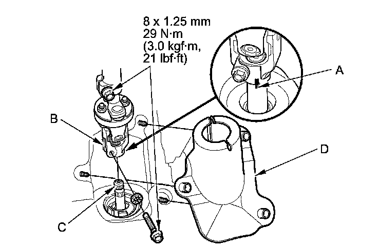 44. Align the reference mark (A) on the steering joint and the steering gearbox pinion shaft. Connect the steering joint (B) to the steering gearbox pinion shaft (C). Loosely install the steering joint bolts.