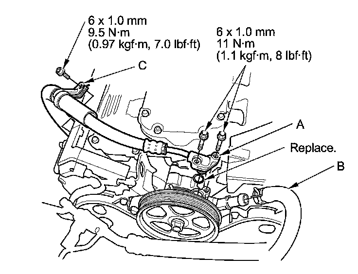 47. Install the power steering pump outlet line (A) and the power steering pump inlet line (B) to the power steering pump and install the power steering hose bracket (C).