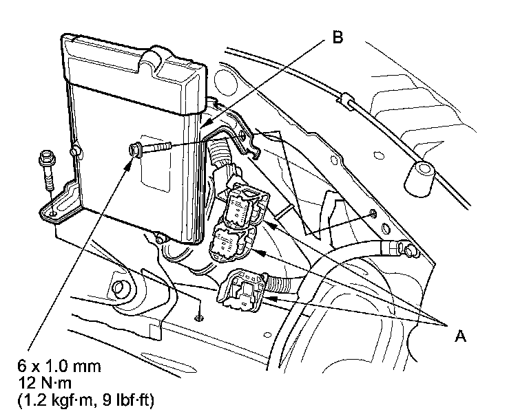 53. Connect the PCM connectors (A), then install the PCM with the bracket (B).