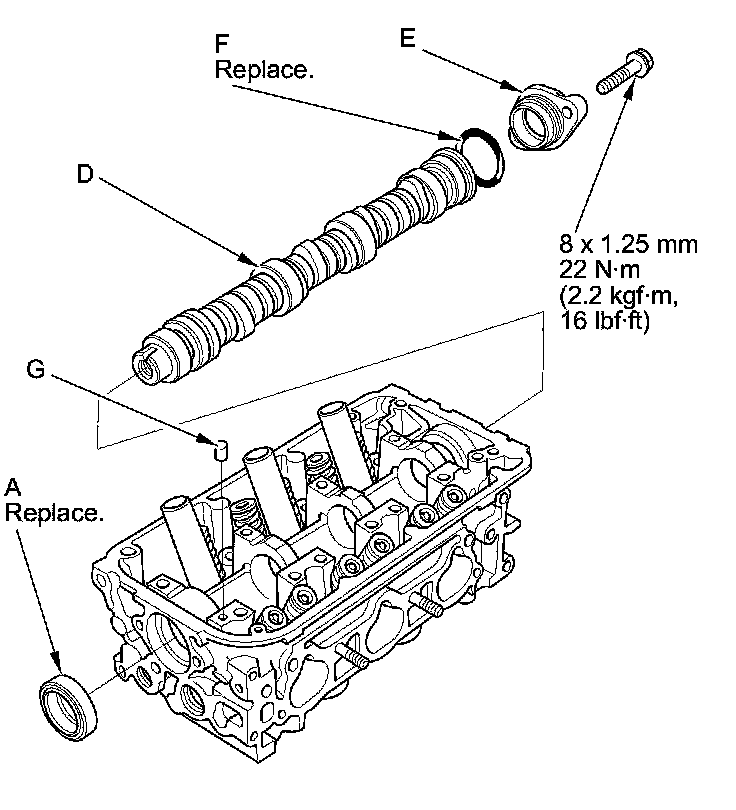 6. Insert the camshaft (D) into the cylinder head, then install the camshaft thrust cover (E). Always use a new O-ring (F). Apply new engine oil to the journals and the cam lobes.
