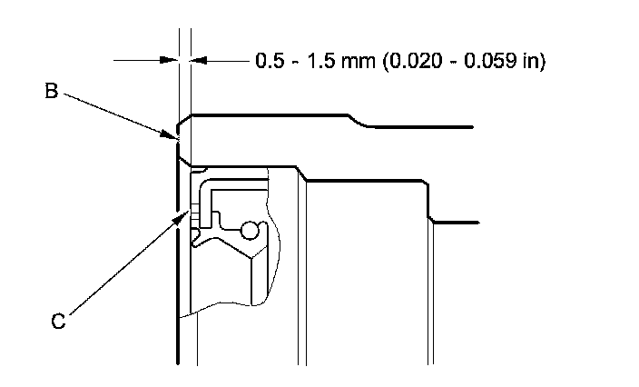 5. Measure the distance between the cylinder head surface (B) and the oil seal (C).