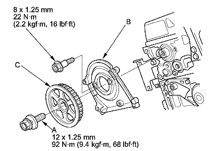 15. Apply new engine oil to the threads of the camshaft pulley mounting bolt (A). Install the back cover (B), then install the camshaft pulley (C).