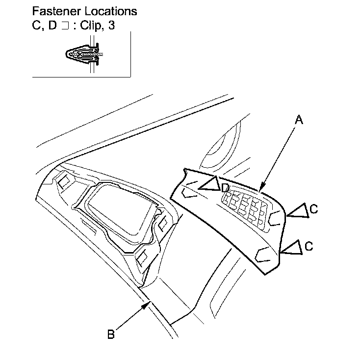 1. Insert the appropriate trim tool into a gap between the trim and the driver's outer middle pad (B), and detach the clips (C).