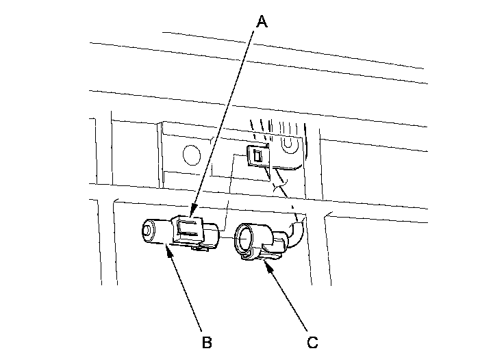1. Lift the tab (A) to release the lock, then remove the outside air temperature sensor (B) from the front bumper beam. Disconnect the 2P connector (C) from the outside air temperature sensor.