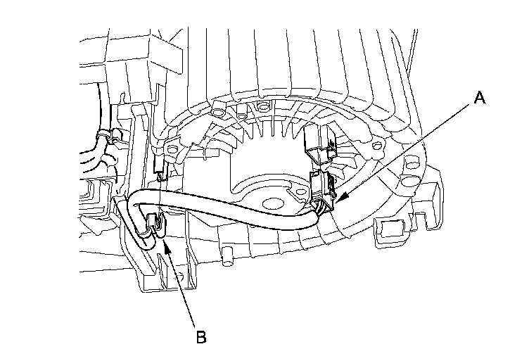 9. Disconnect the connector (A) from the blower motor, and detach the harness clip (B).