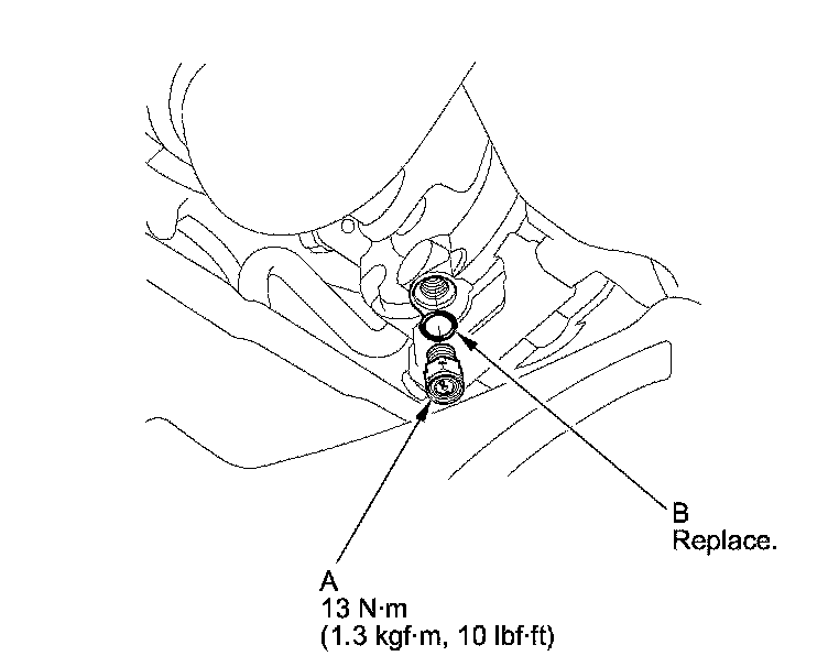 3. Remove the relief valve (A) and the O-ring (B). Plug the opening to keep moisture and foreign material from entering the system, and the A/C compressor oil from running out.