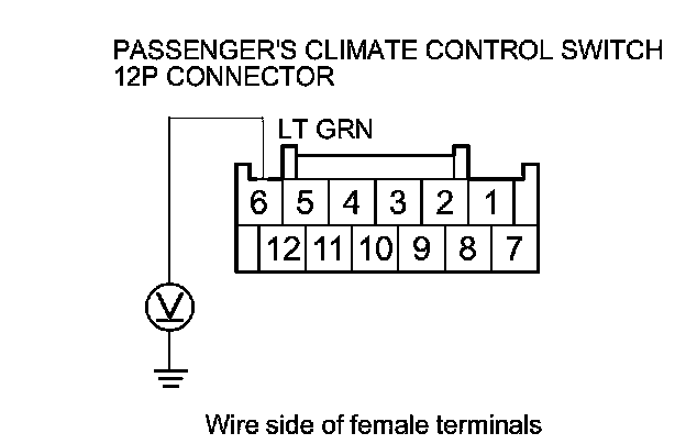 6. Measure the voltage between passenger's climate control switch 12P connector terminal No. 6 and body ground.