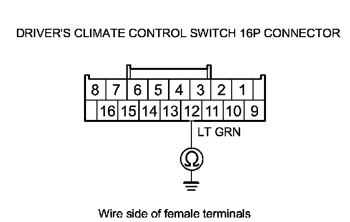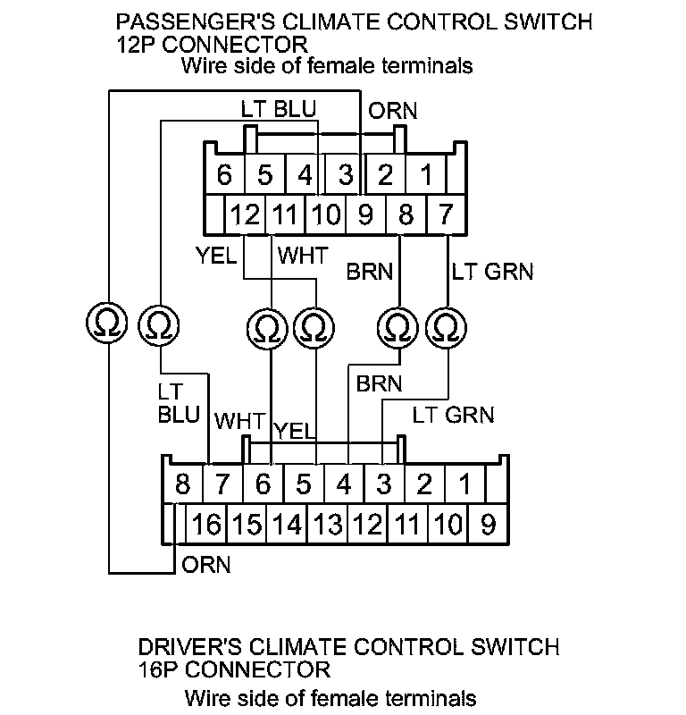 9. Check for continuity between the following terminals of the passenger's climate control switch 12P connector and the driver's climate control switch 16P connector.