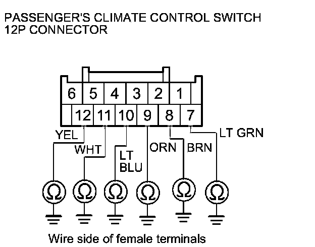 10. Check for continuity between body ground and passenger's climate control switch 12P connector terminals No. 7, No. 8, No. 9, No. 10, No. 11, and No. 12 individually.