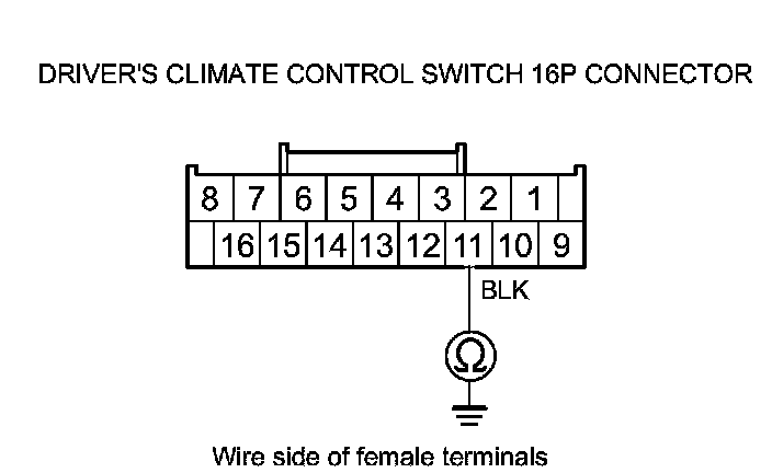16. Check for continuity between driver's climate control switch 16P connector terminal No. 11 and body ground.
