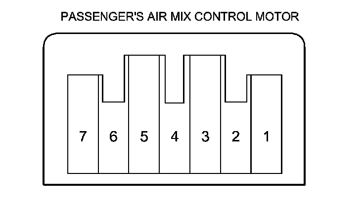 2. Connect battery power to terminal No. 7 of the passenger's air mix control motor, and ground terminal No. 6; the passenger's air mix control motor should run, and stop at Max Cool. If it does not, reverse the connections; the passenger's air mix control motor should run, and stop at Max Hot. When the passenger's air mix control motor stops running, disconnect battery power immediately.
