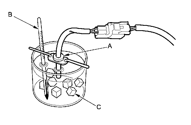 NOTE: To recalibrate the display to the true temperature, remove the outside air temperature sensor (A), but leave it connected. Submerge the sensor and a thermometer (B) in a container of ice water (C). Select the calibration mode as described above, then recalibrate the display to the true temperature.