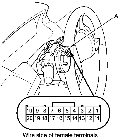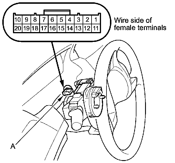 9. Connect cable reel connector A (20P) terminals No. 9 and No. 10 with a jumper wire. The horns should sound.