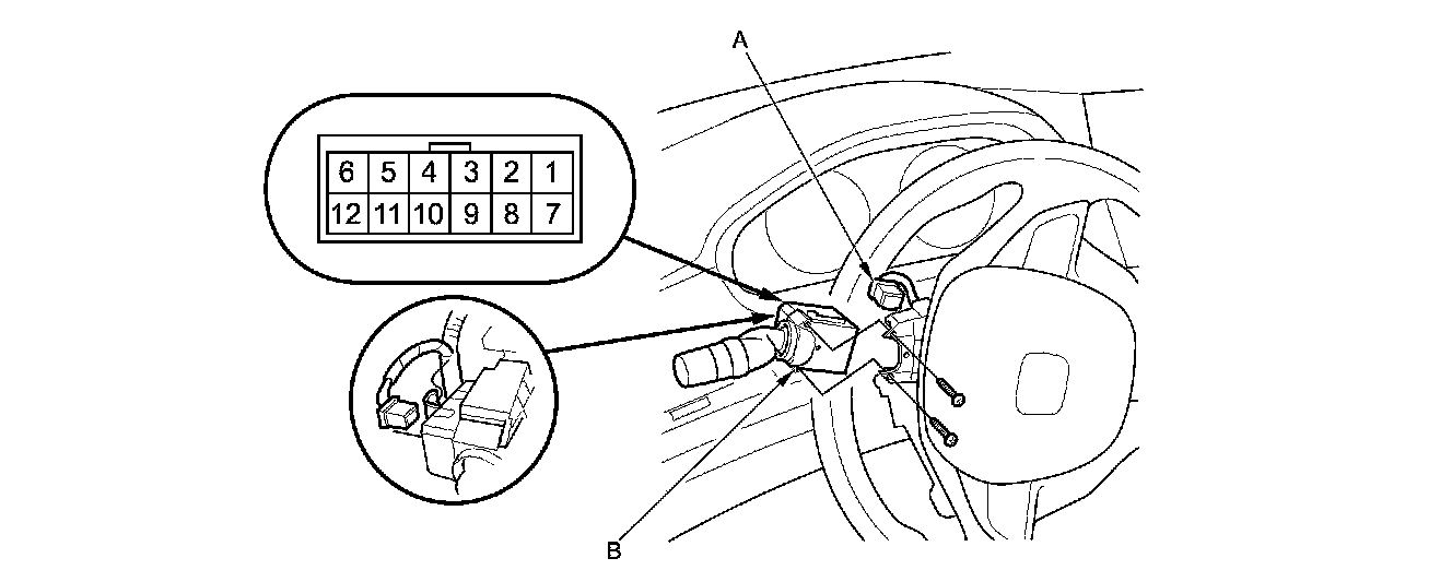 2. Disconnect the 12P connector (A) from the combination light switch (B).